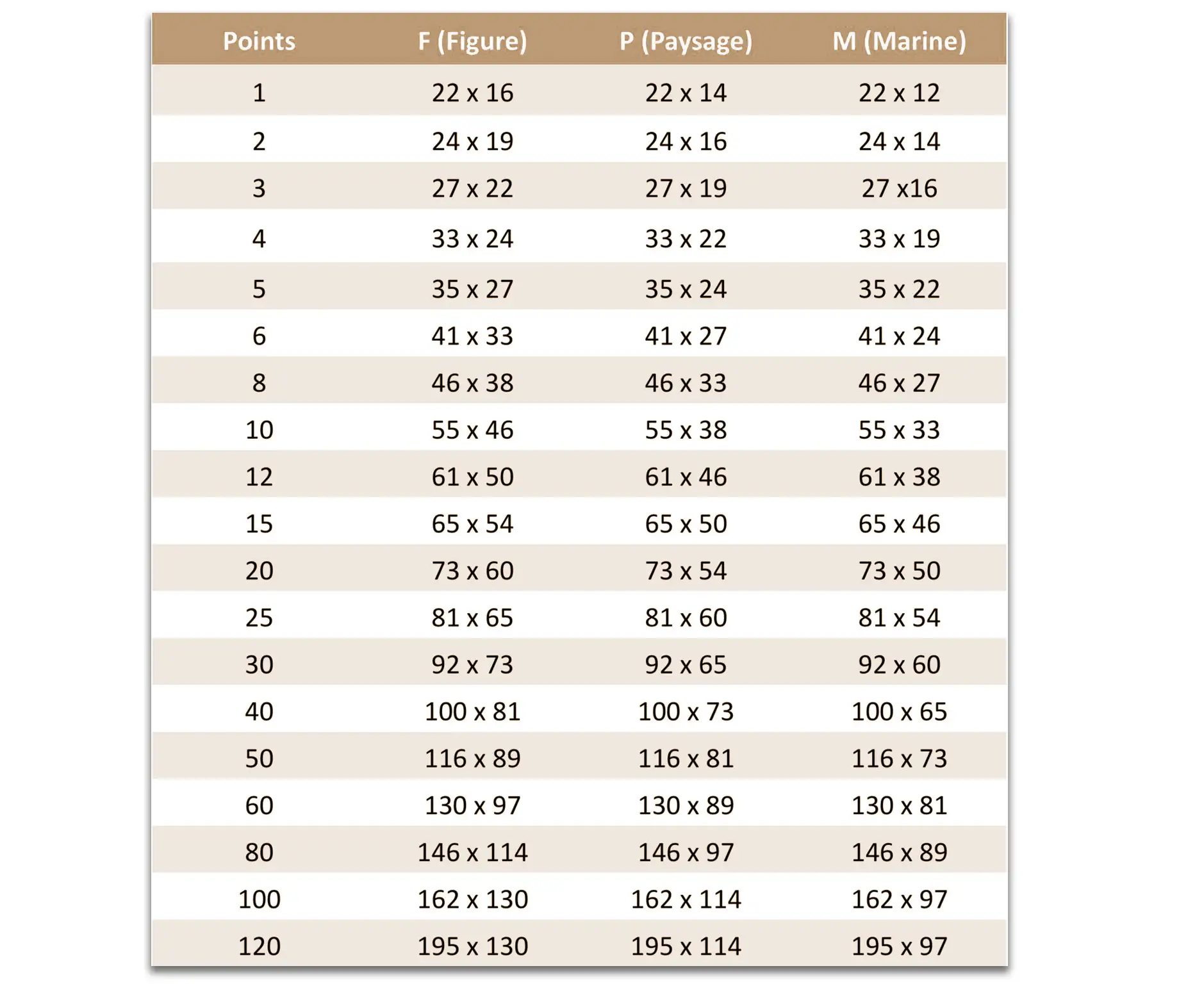 Dans le monde de l’Art, on parle de « formats au point » — un système pratique pour parler d’une toile de 6F, 10P ou 25M, sans avoir à en donner la dimension métrique aussi bien chez le marchand de couleurs, le galeriste ou l’encadreur.